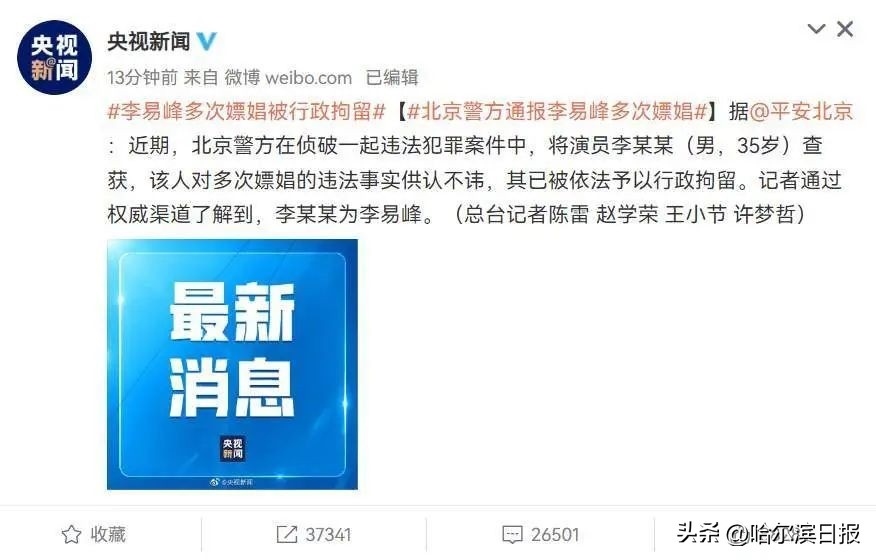 另據(jù)央視消息,確認李某某為演員李易峰。