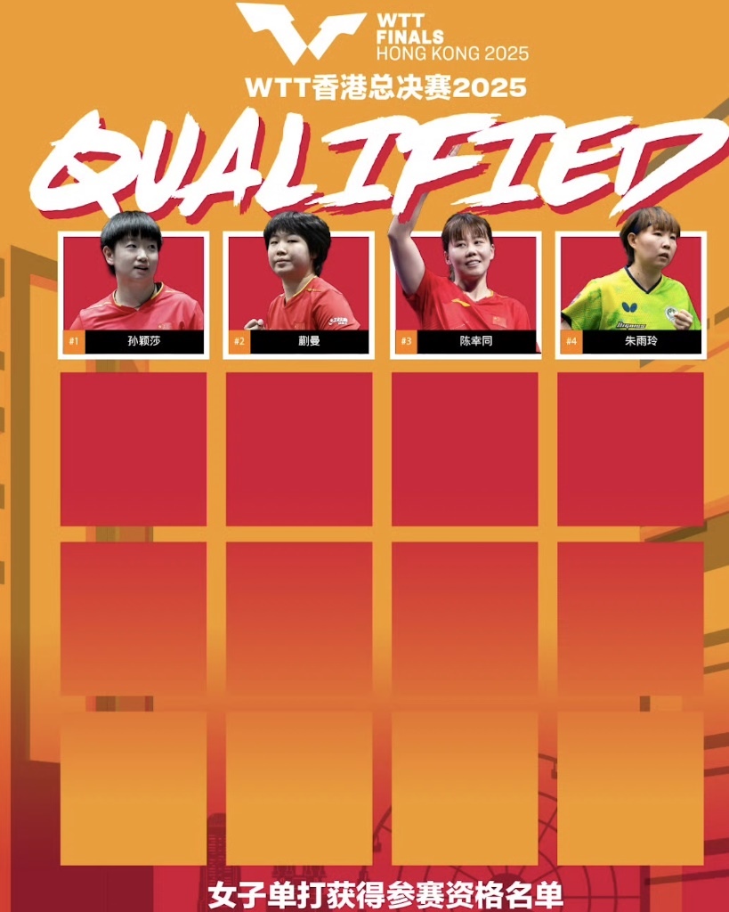 中國隊孫穎莎、蒯曼、陳幸同及中國澳門隊的朱雨玲獲得WTT香港總決賽女子單打參賽資格。圖片來自WTT世界乒聯(lián)官方微博