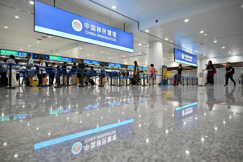 8月27日,在天津?yàn)I海國(guó)際機(jī)場(chǎng)T1航站樓,旅客排隊(duì)入境查驗(yàn)。