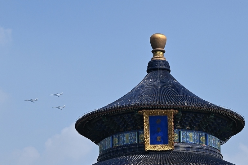 9月3日,紀(jì)念中國人民抗日戰(zhàn)爭暨世界反法西斯戰(zhàn)爭勝利80周年大會在北京隆重舉行。這是在北京天壇公園拍攝的轟炸機(jī)梯隊(duì)。