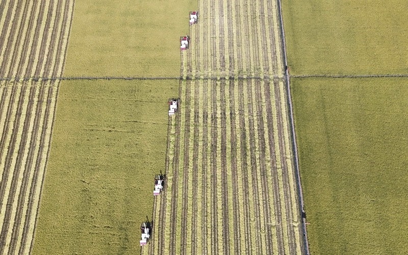 9月5日,在北大荒集團黑龍江江川農場有限公司水稻種植基地,農機手操作農機收割水稻(無人機照片)。