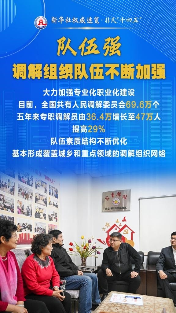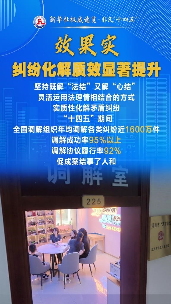“十四五”期間,司法部堅持和發(fā)展新時代“楓橋經(jīng)驗”,充分發(fā)揮調(diào)解職能作用,以“機制全、領(lǐng)域廣、隊伍強、效果實”十二字為工作“秘訣”,大力加強矛盾糾紛排查化解,切實保障群眾合法權(quán)益,維護(hù)社會和諧穩(wěn)定。