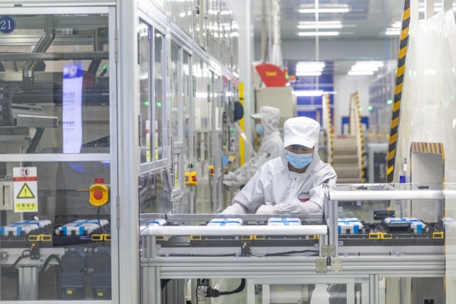 2024年9月27日,在位于重慶市銅梁區(qū)的海辰儲能重慶制造基地,工作人員在生產(chǎn)線上初步檢測兩個電芯是否配對。新華社記者 黃偉 攝