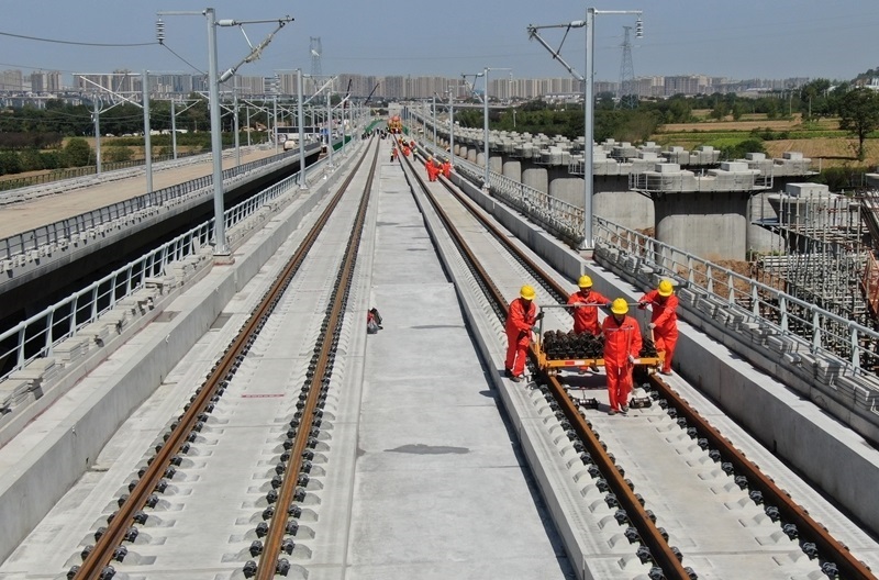 9月8日,施工人員在西十高鐵西安東至藍田區(qū)間鋪設無縫鋼軌(無人機照片)。