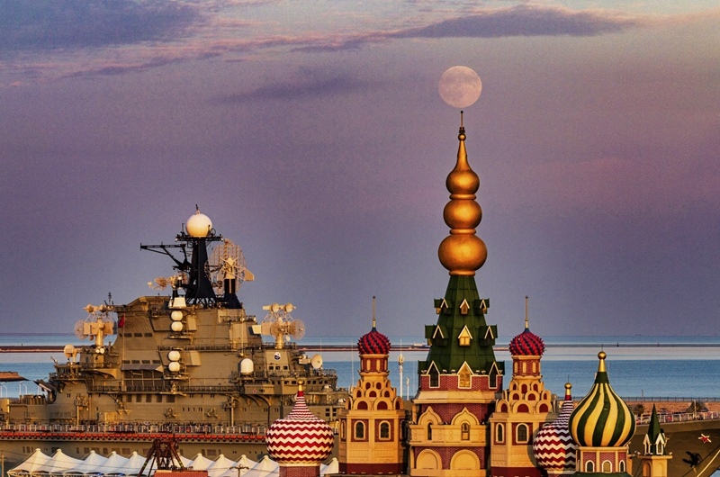 10月6日在天津市濱海新區(qū)泰達(dá)航母主題公園拍攝的中秋滿(mǎn)月(無(wú)人機(jī)照片)。