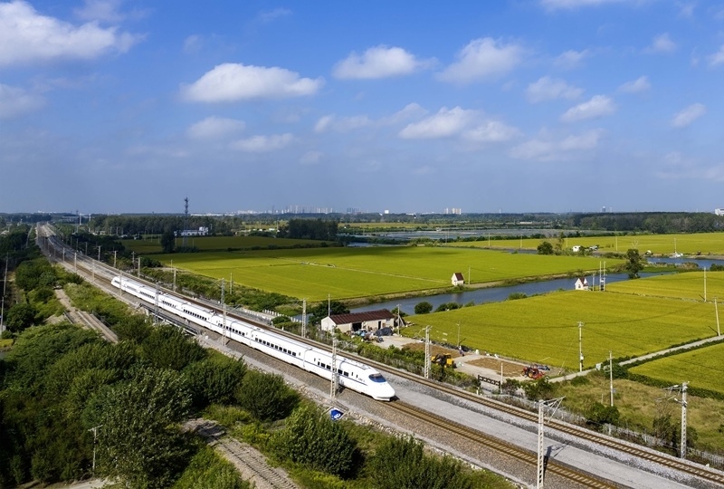10月10日,列車行駛在寧啟鐵路江蘇揚(yáng)州段(無人機(jī)照片)。