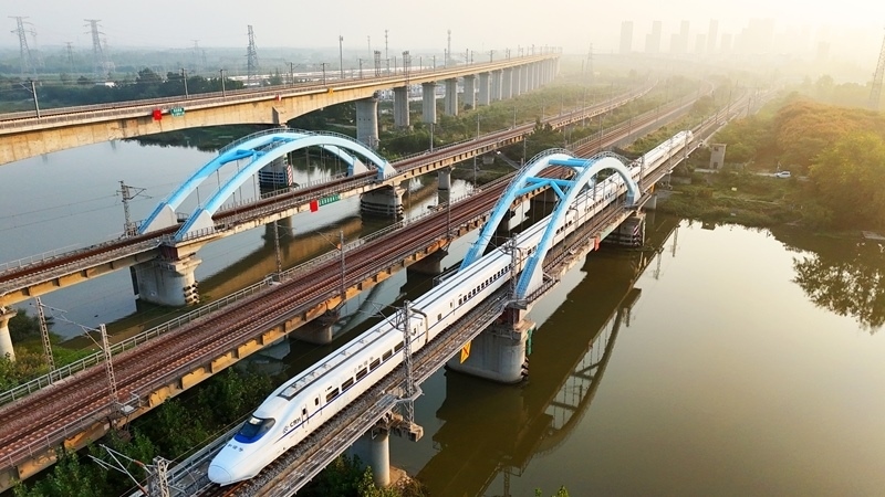 10月10日在江蘇南京拍攝的行駛中的動車組列車(無人機(jī)照片)。