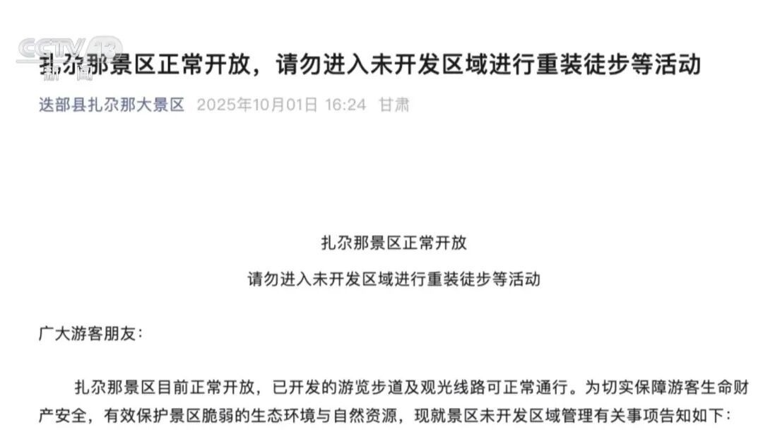 假期第一天,扎尕那景區(qū)宣布,嚴(yán)禁任何組織或個(gè)人未經(jīng)批準(zhǔn)擅自進(jìn)入其未開發(fā)區(qū)域開展重裝徒步等活動(dòng)。