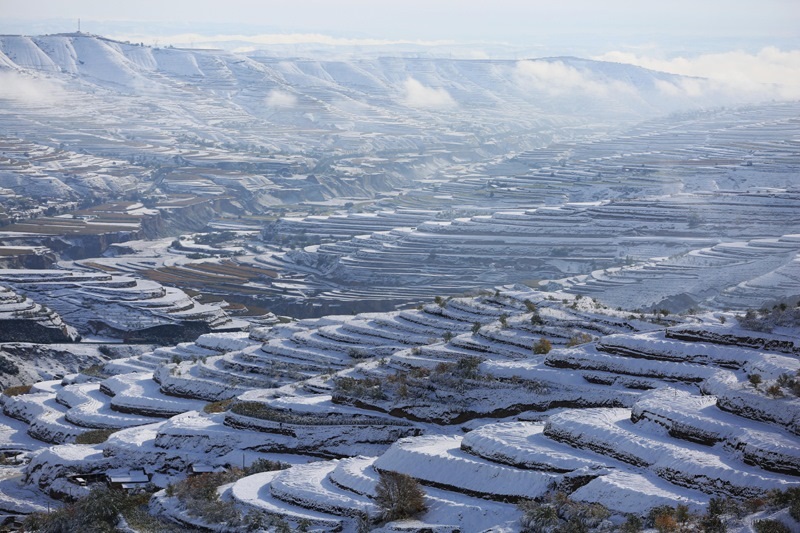 這是10月17日在甘肅永靖縣陳井鎮(zhèn)拍攝的雪后梯田(無(wú)人機(jī)照片)。