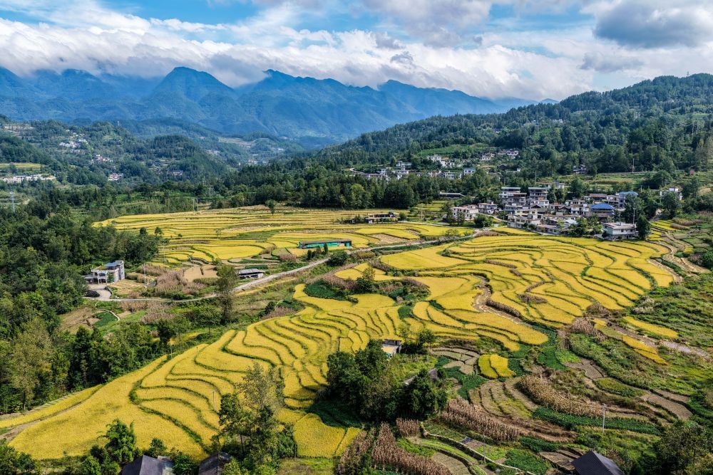 9月18日拍攝的重慶市黔江區(qū)五里鎮(zhèn)梯田景色(無人機照片)。地處武陵山區(qū)腹地的重慶市黔江區(qū)五里鎮(zhèn)水稻種植面積5300畝,是武陵山地區(qū)糧食主要產(chǎn)區(qū)之一。新華社記者 唐奕 攝