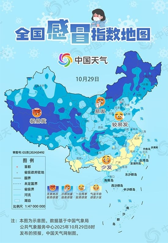 中國(guó)天氣網(wǎng)提醒,秋冬時(shí)節(jié)冷空氣活躍,氣溫多起伏,感冒多發(fā)。良好的生活習(xí)慣有助于預(yù)防感冒,建議大家日常生活中均衡飲食、適量運(yùn)動(dòng)、保證充足睡眠,避免過(guò)度勞累。同時(shí)在流感高發(fā)時(shí)期外出盡量戴好口罩,注意勤消毒,還可通過(guò)注射疫苗降低流感風(fēng)險(xiǎn)。(文/江漪 設(shè)計(jì)/王維一 數(shù)據(jù)支持/董靜舒 李寧 審核/祁保剛 劉紅欣 張慧 劉文靜 余曉芬)