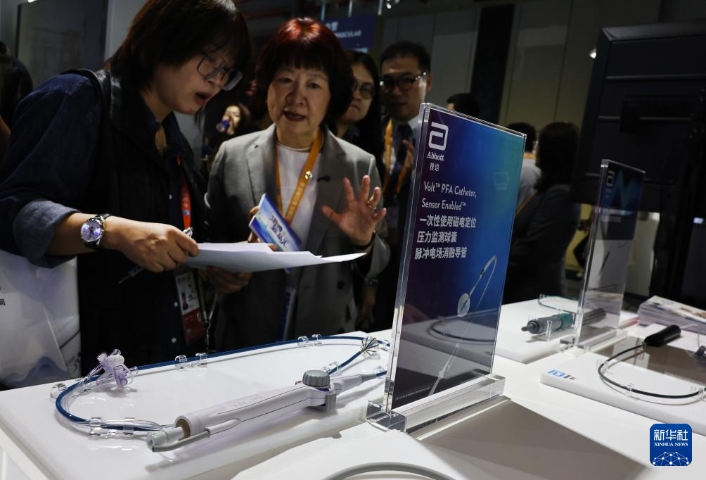 11月6日,參觀者在雅培公司一款磁電定位壓力監(jiān)測球囊脈沖電場消融導管展品前駐足觀看,這是該產(chǎn)品的亞洲首展。