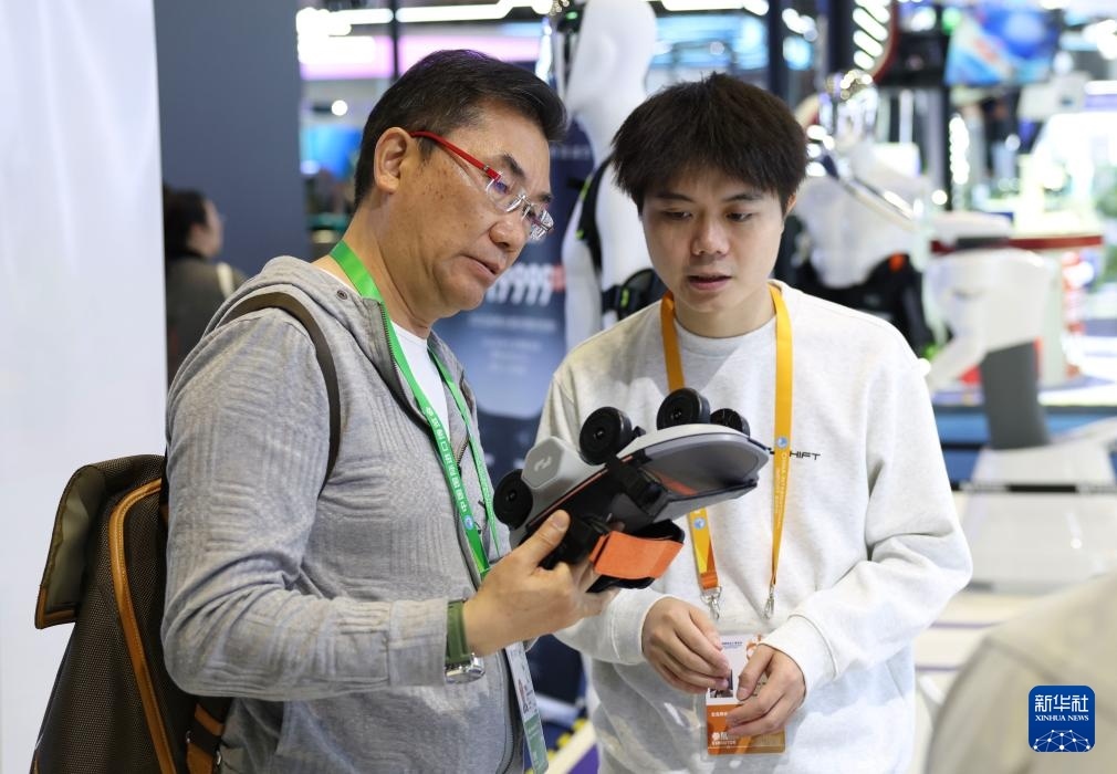 11月6日,在進博會創(chuàng)新孵化專區(qū)瞬動科技展臺,一名展商(右)向參觀者介紹其全球首發(fā)的踏月者Air輪式外骨骼。