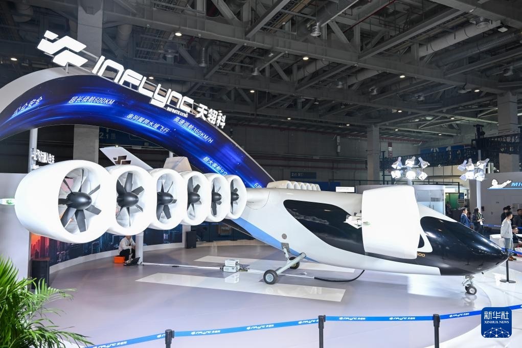 11月6日在進博會汽車及智慧出行展區(qū)天翎科展臺拍攝的L600全尺寸傾轉(zhuǎn)涵道翼eVTOL。這是該產(chǎn)品全球首發(fā)。