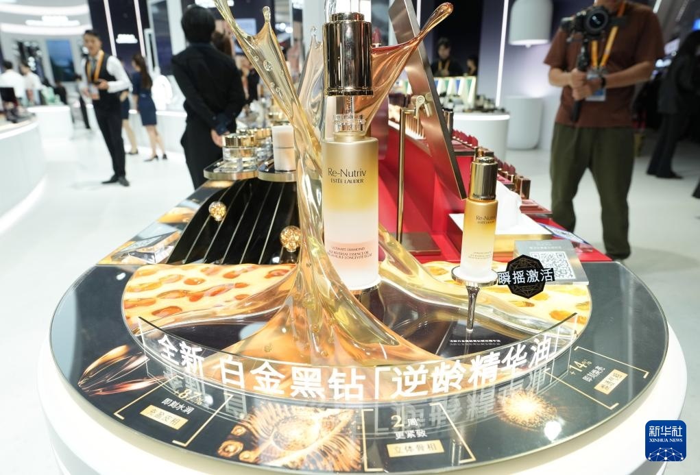 11月6日在進博會消費品展區(qū)拍攝的雅詩蘭黛白金黑鉆逆齡精華油。這是該產(chǎn)品在中國首發(fā)。