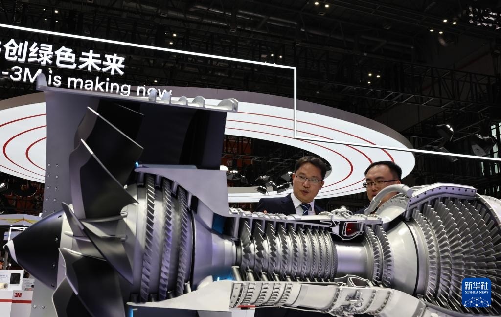 11月5日,參觀者在通用電氣展臺展出的一款LEAP-1C發(fā)動機模型前交流討論,這也是該型號發(fā)動機的中國首展。