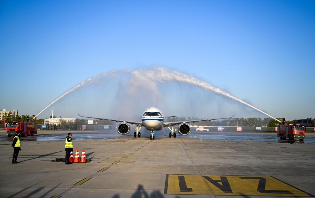 新華社天津11月9日電(記者王聿昊、劉惟真)11月9日,國航C919重飛“兩航起義”航線主題航班從香港飛抵天津,重溫76年前“兩航起義”的北飛航程,致敬“兩航起義”愛國壯舉。