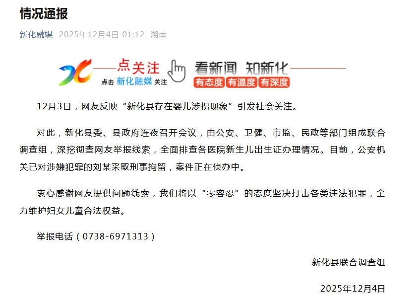 中新網(wǎng)12月4日電 針對網(wǎng)友反映的“新化縣存在嬰兒涉拐現(xiàn)象”,湖南省婁底市新化縣聯(lián)合調查組12月4日發(fā)布情況通報稱,新化縣委、縣政府連夜召開會議,由公安、衛(wèi)健、市監(jiān)、民政等部門組成聯(lián)合調查組,深挖徹查網(wǎng)友舉報線索,全面排查各醫(yī)院新生兒出生證辦理情況。