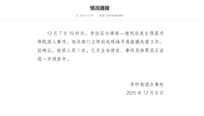 中新網(wǎng)12月8日電 青島李村街道辦事處8日在青島李滄政務(wù)網(wǎng)發(fā)布情況通報(bào)稱,12月7日19時(shí)許,李滄區(qū)大嶗路一便利店發(fā)生簡(jiǎn)易升降機(jī)困人事件。相關(guān)部門立即趕赴現(xiàn)場(chǎng)開展救援處置工作。經(jīng)確認(rèn),被困人員1名,已無生命體征。事件具體原因正在進(jìn)一步調(diào)查中。