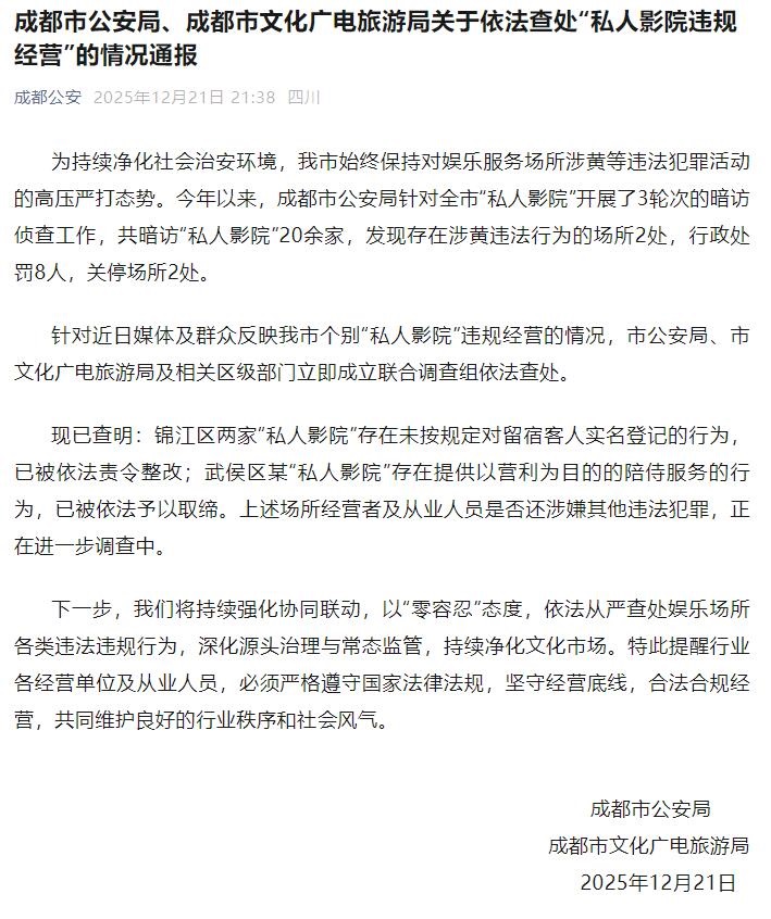 據(jù)“成都公安”微信公眾號(hào)消息,12月21日晚,成都市公安局、成都市文化廣電旅游局發(fā)布關(guān)于依法查處“私人影院違規(guī)經(jīng)營(yíng)”的情況通報(bào):今年以來(lái),成都市公安局針對(duì)全市“私人影院”開(kāi)展了3輪次的暗訪偵查工作,共暗訪“私人影院”20余家,發(fā)現(xiàn)存在涉黃違法行為的場(chǎng)所2處,行政處罰8人,關(guān)停場(chǎng)所2處。