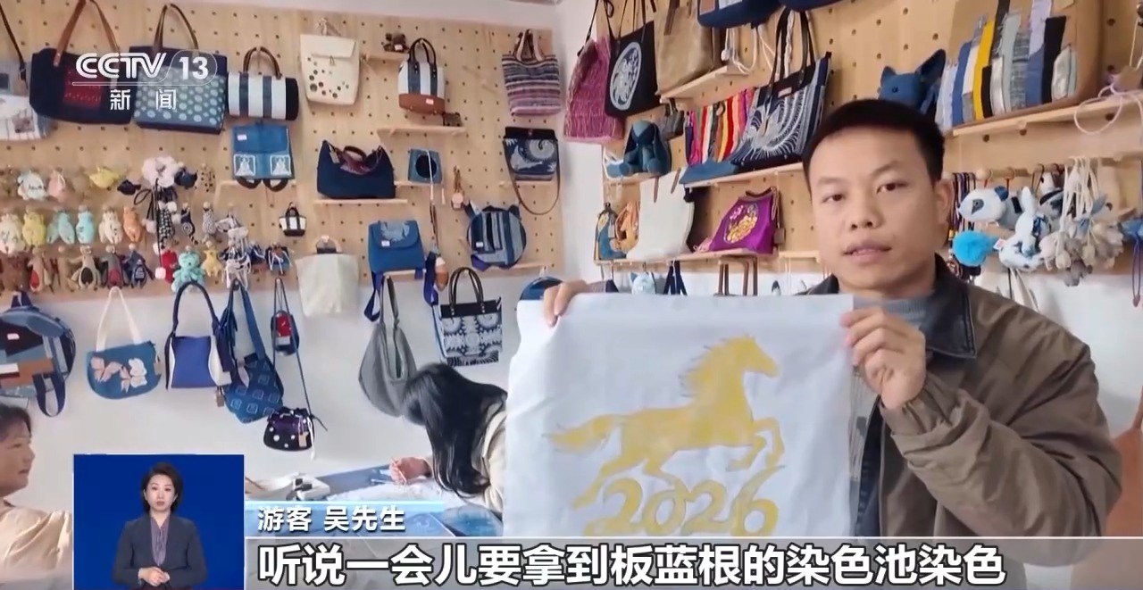 游客 吳先生:我畫的是一幅奔馬,聽說一會兒要拿到板藍(lán)根的染色池染色,脫蠟以后做成方巾。明年是2026年,祝大家馬到成功。