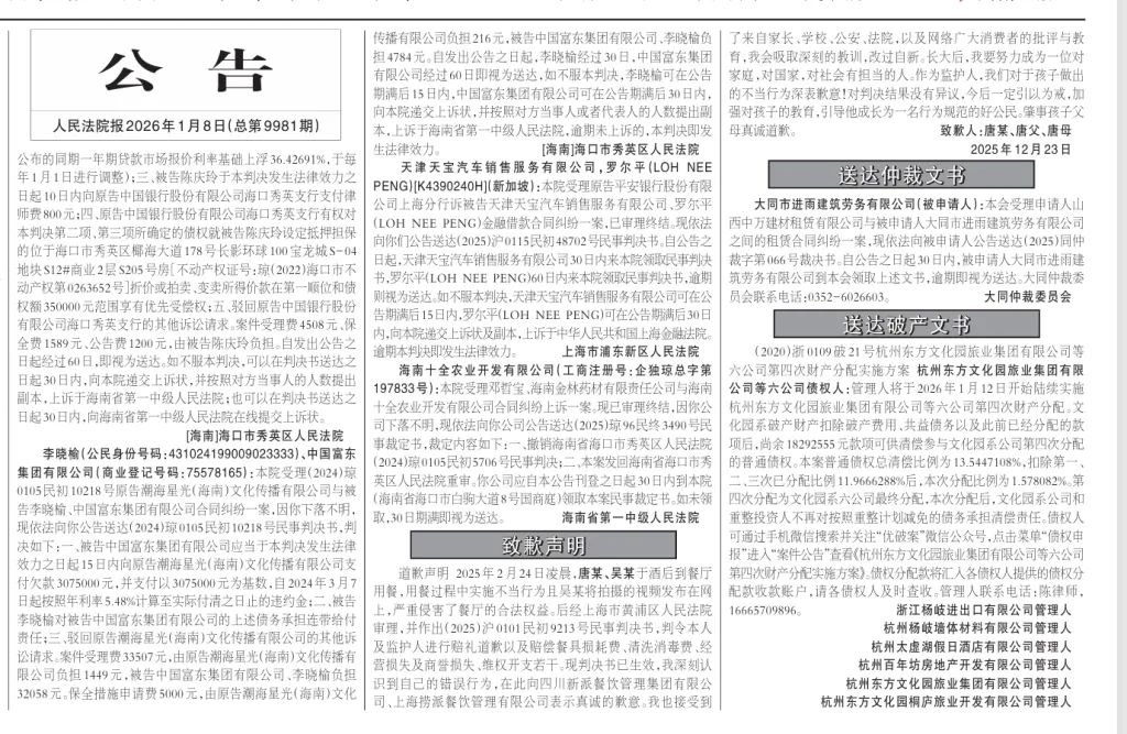 2026年1月8日,《人民法院報》3版刊登了“海底撈小便”當(dāng)事人唐某及其父母的道歉聲明。