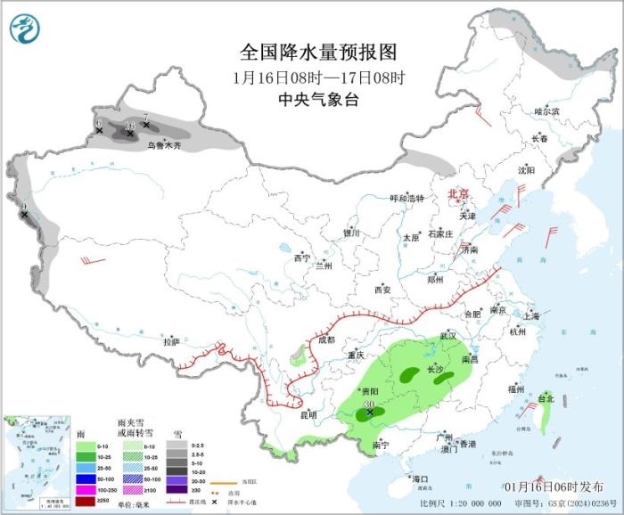 1月16日08時至17日08時,新疆沿天山地區(qū)及南疆西部山區(qū),黑龍江北部、吉林東部、西藏西部等地部分地區(qū)有小到中雪,其中,新疆沿天山西部地區(qū)和伊犁河谷等地部分地區(qū)有大到暴雪(10~16毫米);江南中西部、貴州東部和南部、廣西西部和北部、云南南部、臺灣島東部等地部分地區(qū)有小到中雨,廣西西北部局地有大雨(25~30毫米)。內(nèi)蒙古中東部、華北北部、黃淮中東部、遼寧南部、西藏中西部等地部分地區(qū)有4~6級風(fēng);渤海、渤海海峽、黃海北部和中部有5~7級風(fēng)、陣風(fēng)8級(見圖1)。