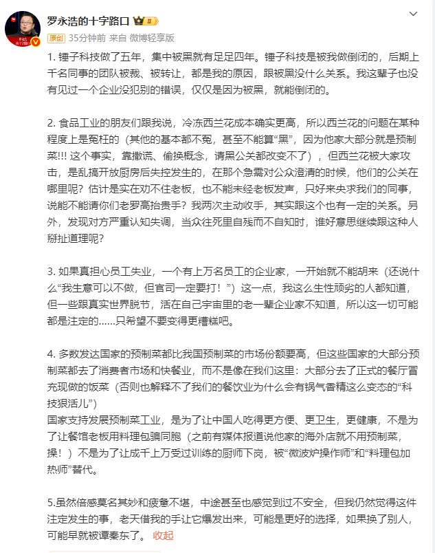1月16日,@羅永浩的十字路口 再次發(fā)長(zhǎng)文回應(yīng)西貝賈國(guó)龍近日的言論。他表示,錘子科技做了五年,集中被黑就有足足四年。錘子科技是被我做倒閉的,后期上千名同事的團(tuán)隊(duì)被裁、被轉(zhuǎn)讓,都是我的原因,跟被黑沒什么關(guān)系。我這輩子也沒有見過(guò)一個(gè)企業(yè)沒犯別的錯(cuò)誤,僅僅是因?yàn)楸缓?,就能倒閉的。