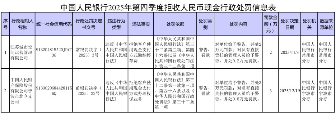 據(jù)中國人民銀行微信公眾號消息,2025年第四季度,中國人民銀行對2家核實為拒收人民幣現(xiàn)金的單位及相關(guān)責(zé)任人依法作出經(jīng)濟(jì)處罰。廣大經(jīng)營主體應(yīng)強(qiáng)化法治觀念,尊重公眾支付選擇權(quán),共同打造和諧現(xiàn)金流通環(huán)境。