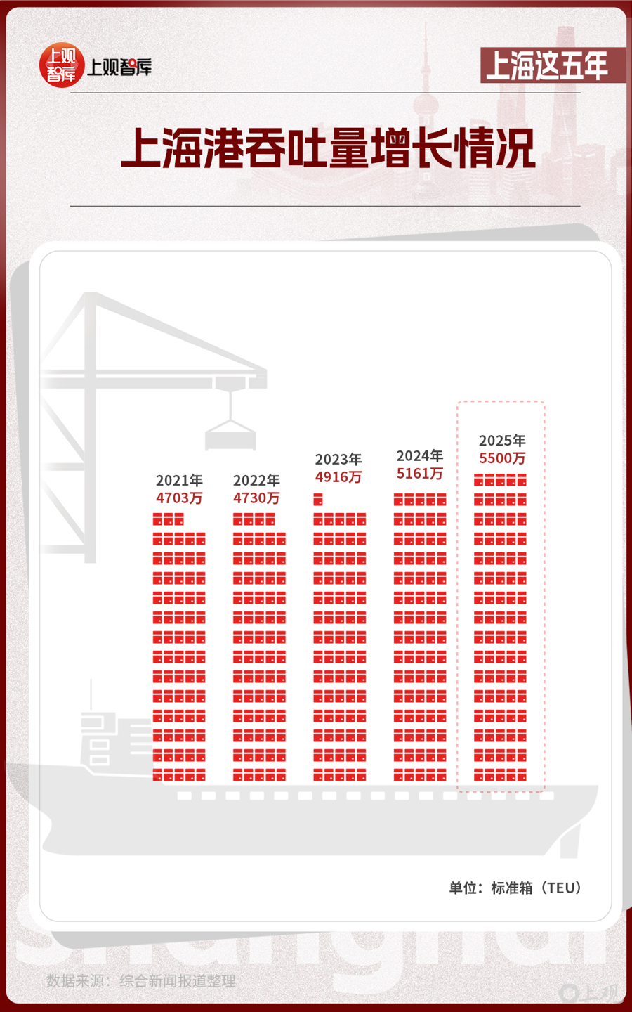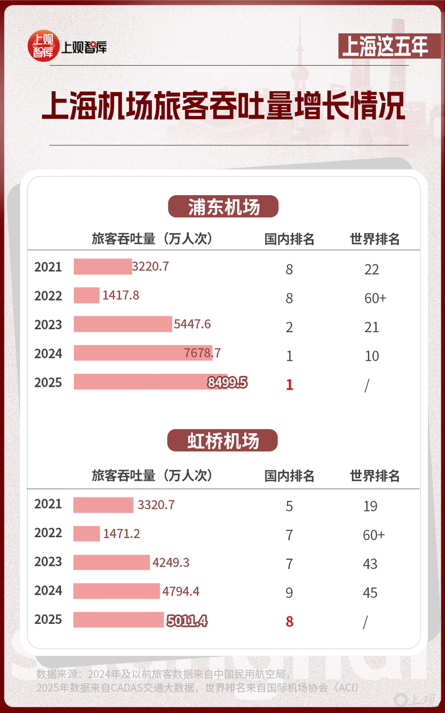 2024年,上海浦東國際機(jī)場首次排名全國旅客吞吐量第一,榮登中國最繁忙的機(jī)場。也是在這一年,上海港成為全球首個(gè)年吞吐量超過5000萬標(biāo)準(zhǔn)箱的世界大港。