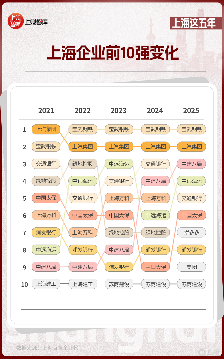 這份由上海市企業(yè)聯(lián)合會、上海市企業(yè)家協(xié)會、上海市經(jīng)濟(jì)團(tuán)體聯(lián)合會和解放日報(bào)社共同發(fā)布的榜單,從2021年到2025年,見證了傳統(tǒng)企業(yè)的轉(zhuǎn)型與創(chuàng)新企業(yè)的涌現(xiàn)。在前10強(qiáng)的名單中,制造業(yè)仍然是上海產(chǎn)業(yè)的壓艙石,而房地產(chǎn)、建筑企業(yè)從2021年占比達(dá)40%,到2025年占比降低為20%?;ヂ?lián)網(wǎng)企業(yè)在2025年沖上前10強(qiáng),并占據(jù)了20%的席位,亮出了上海經(jīng)濟(jì)多元發(fā)展的成績單。