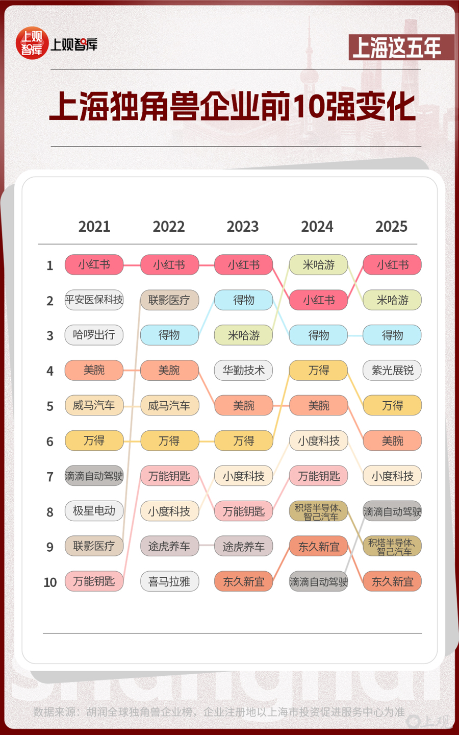 前10位的上海獨(dú)角獸企業(yè),從2021年到2025年,發(fā)生了不小的改變。有的企業(yè)已經(jīng)上市,如聯(lián)影醫(yī)療、華勤技術(shù)等;有的企業(yè)悄然退場;有的企業(yè)仍持續(xù)霸榜,如小紅書、米哈游、得物、美腕、萬得。獨(dú)角獸企業(yè)的變動(dòng)與產(chǎn)業(yè)趨勢息息相關(guān)。當(dāng)新能源汽車產(chǎn)業(yè)進(jìn)入高質(zhì)量發(fā)展的階段時(shí),智己汽車接過領(lǐng)軍大旗;在AI芯片成為市場熱點(diǎn)時(shí),積塔半導(dǎo)體、紫光展銳已躋身芯片新勢力代表之列。