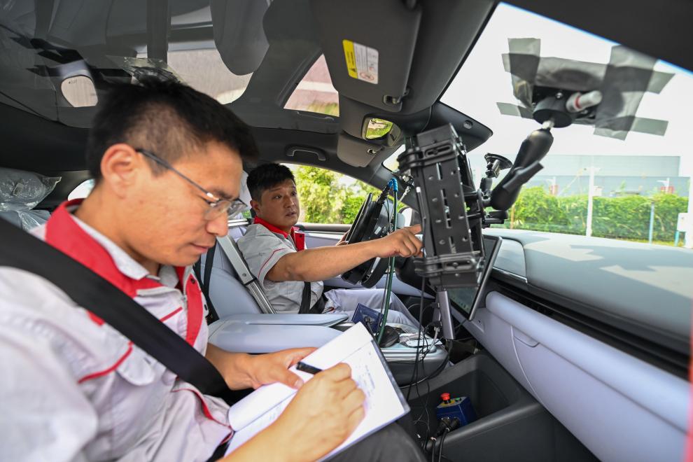 測試員在一輛智能網(wǎng)聯(lián)汽車內(nèi)做測試。新華社記者 孫凡越 攝
