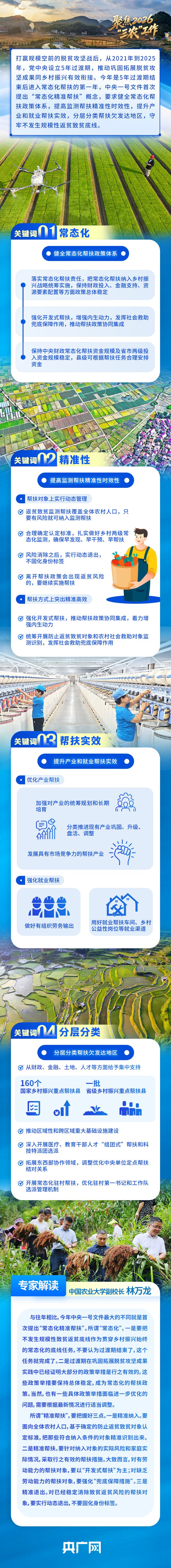 2月3日,立春節(jié)氣前夕,《中共中央 國務(wù)院關(guān)于錨定農(nóng)業(yè)農(nóng)村現(xiàn)代化 扎實(shí)推進(jìn)鄉(xiāng)村全面振興的意見》向社會公布。這是黨的十八大以來,中央連續(xù)出臺的第14個指導(dǎo)“三農(nóng)”工作的一號文件,也是“十五五”時期的首個中央一號文件。今年中央一號文件首次提出實(shí)施“常態(tài)化精準(zhǔn)幫扶”,并對此作出系統(tǒng)性部署。如何理解“常態(tài)化”?怎樣把“精準(zhǔn)幫扶”落到實(shí)處?央廣網(wǎng)約請相關(guān)專家進(jìn)行解讀。