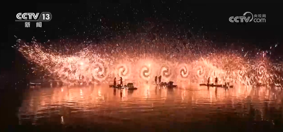 夜幕降臨,古城外的打鐵花表演震撼上演,表演者將滾燙的鐵水拋向空中,鐵水瞬間炸裂,金花四濺,如流星劃過夜空,引得現(xiàn)場喝彩聲此起彼伏。