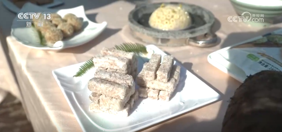 除了好看,當然也有好吃的。當?shù)氐募t糖年糕寓意著“年年高、步步高”。還有一道是用本地檳榔芋做成的掛霜芋,將芋塊加入白糖翻炒,表面裹上一層細細的糖霜,粉粉糯糯,是每家每戶逢年過節(jié)的必備菜肴。