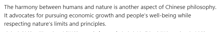 文章還認(rèn)為,人與自然的和諧是中國(guó)哲學(xué)的另一個(gè)方面。它主張?jiān)谧非蠼?jīng)濟(jì)增長(zhǎng)和人民福祉的同時(shí),尊重自然的發(fā)展規(guī)律。