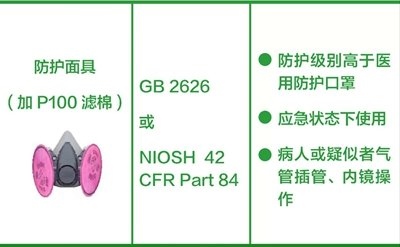 防護(hù)面具(加P100濾棉):防護(hù)級(jí)別高于醫(yī)用防護(hù)口罩,建議用于確診或疑似病例的氣管插管、內(nèi)鏡等操作。(橫列為口罩的圖片+名稱、產(chǎn)品標(biāo)準(zhǔn)、建議應(yīng)用場(chǎng)景。圖片來(lái)源:中國(guó)疾控中心)