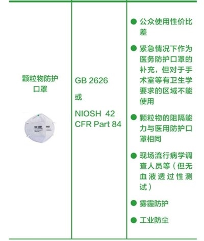 工業(yè)防顆粒物口罩:顆粒物的阻隔能力與醫(yī)用防護(hù)口罩類似,可用于工業(yè)防塵和霧霾防護(hù)。由于該類口罩無(wú)血液透過(guò)性測(cè)試,不推薦公眾佩戴,也不能用于手術(shù)室等有衛(wèi)生學(xué)要求的區(qū)域。(橫列為口罩的圖片+名稱、產(chǎn)品標(biāo)準(zhǔn)、建議應(yīng)用場(chǎng)景。圖片來(lái)源:中國(guó)疾控中心)