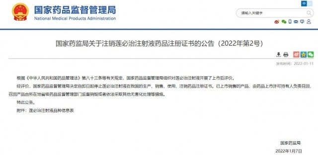 據(jù)國(guó)家藥監(jiān)局網(wǎng)站消息,國(guó)家藥品監(jiān)督管理局11日發(fā)布公告,決定自即日起停止蓮必治注射液在我國(guó)的生產(chǎn)、銷(xiāo)售、使用,注銷(xiāo)藥品注冊(cè)證書(shū)。已上市銷(xiāo)售的產(chǎn)品,由藥品上市許可持有人負(fù)責(zé)召回,召回產(chǎn)品由所在地省級(jí)藥品監(jiān)督管理部門(mén)監(jiān)督銷(xiāo)毀或者依法采取其他無(wú)害化處理等措施。