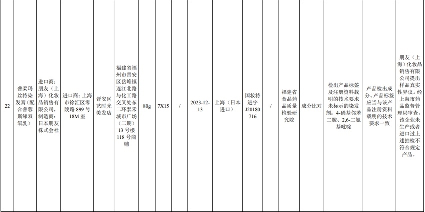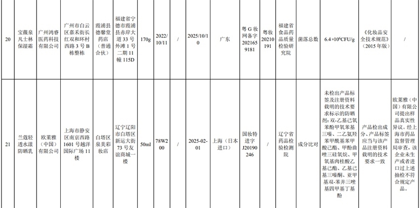 記者注意到,其中,產(chǎn)品標(biāo)簽標(biāo)示為歐萊雅(中國)有限公司生產(chǎn)的蘭蔻輕透水漾防曬乳(標(biāo)示批號:78W200)“未檢出產(chǎn)品標(biāo)簽及注冊資料載明的技術(shù)要求標(biāo)示的防曬劑”;產(chǎn)品標(biāo)簽標(biāo)示為朋友(上海)化妝品銷售有限公司進(jìn)口的普柔瑪絲特染發(fā)膏(配合普蓉斯綈雙氧乳)(標(biāo)示批號:7X15)“檢出產(chǎn)品標(biāo)簽及注冊資料載明的技術(shù)要求未標(biāo)示的染發(fā)劑”;產(chǎn)品標(biāo)簽標(biāo)示為資生堂(中國)投資有限公司經(jīng)銷的安熱沙金燦倍護(hù)防曬啫喱(標(biāo)示批號:1356TD)“產(chǎn)品標(biāo)簽與注冊資料載明的技術(shù)要求不一致”、“未檢出產(chǎn)品標(biāo)簽標(biāo)示的防曬劑”、“未檢出注冊資料載明的技術(shù)要求標(biāo)示的防曬劑”。