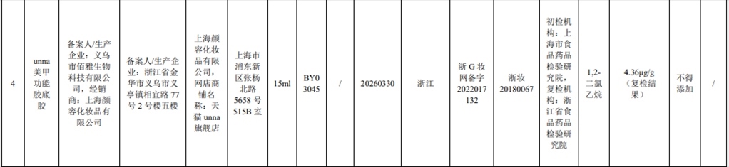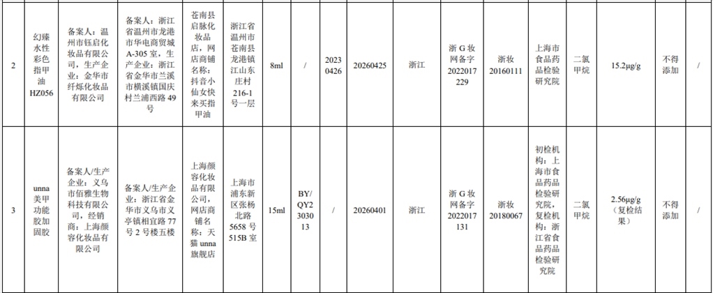 根據(jù)通告,在2023年國家化妝品抽樣檢驗(yàn)工作中,經(jīng)上海市食品藥品檢驗(yàn)研究院等單位檢驗(yàn),產(chǎn)品標(biāo)簽標(biāo)示委托方為溫州市鈺啟化妝品有限公司、受托生產(chǎn)企業(yè)為金華市纖爍化妝品有限公司生產(chǎn)的幻臻水性彩色指甲油HZ088等7批次化妝品不符合規(guī)定,檢出《化妝品安全技術(shù)規(guī)范(2015年版)》中規(guī)定的禁用原料。