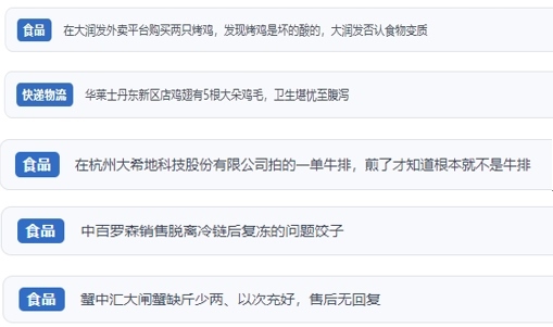 “人民投訴”上不少網(wǎng)友反映,“外賣商家銷售排骨套餐中含過期飲料”“外賣店鋪吃出蟑螂,商家不按照食品安全法賠償” “直播間購買車?yán)遄?,虛假宣?J、原裝進(jìn)口,到貨嚴(yán)重貨不對(duì)板”“網(wǎng)購東北珍珠貢米,到貨包裝上執(zhí)行標(biāo)準(zhǔn)是廢止的標(biāo)準(zhǔn)”“超市買的梅花肉切開發(fā)現(xiàn)是淋巴肉”“平臺(tái)商家承諾枸杞不熏硫酸,實(shí)則檢測(cè)后含硫超標(biāo)”“知名便利店售賣脫離冷鏈后多次復(fù)凍的餃子”等。