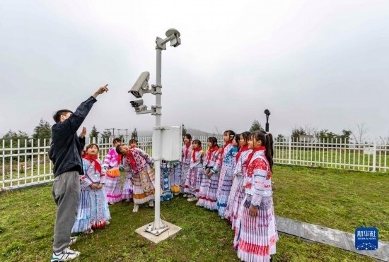 3月23日,學(xué)生在貴州省黔西市氣象局綜合氣象觀測(cè)站聽(tīng)工作人員講解智能觀測(cè)儀工作原理。
