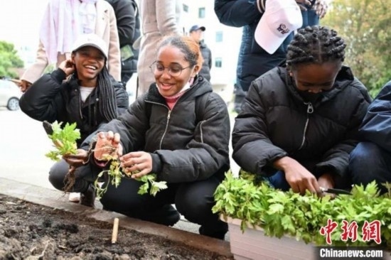 同濟大學(xué)的留學(xué)生們一起種下艾草、杜仲等中草藥,零距離感受中醫(yī)文化的奇妙之處。同濟大學(xué)供圖