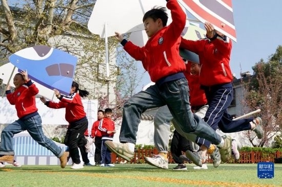 3月31日,徐州市漢橋小學(xué)的學(xué)生進(jìn)行“列車(chē)競(jìng)速”游戲。