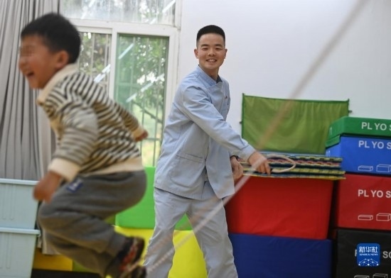 3月30日,在西安市金色陽光康復(fù)中心,特教老師指導(dǎo)孩子進(jìn)行康復(fù)訓(xùn)練。