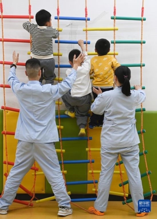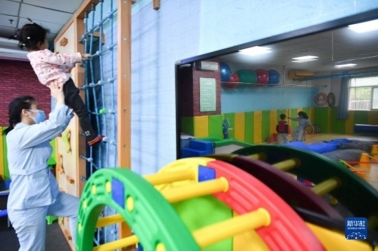 3月30日,在西安市金色陽光康復(fù)中心,特教老師為孩子進(jìn)行康復(fù)訓(xùn)練。