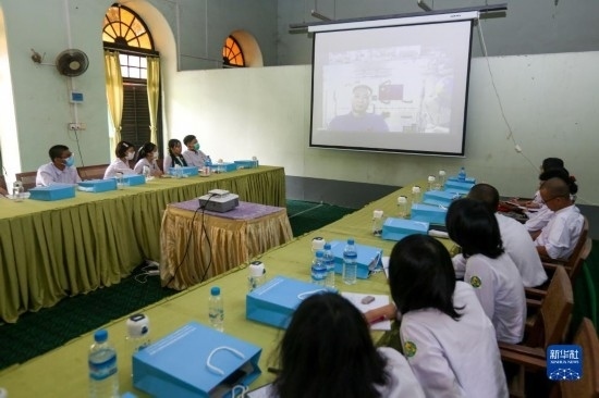 這是4月20日在緬甸仰光一所高中拍攝的“天宮對(duì)話”活動(dòng)線上課堂現(xiàn)場(chǎng)。