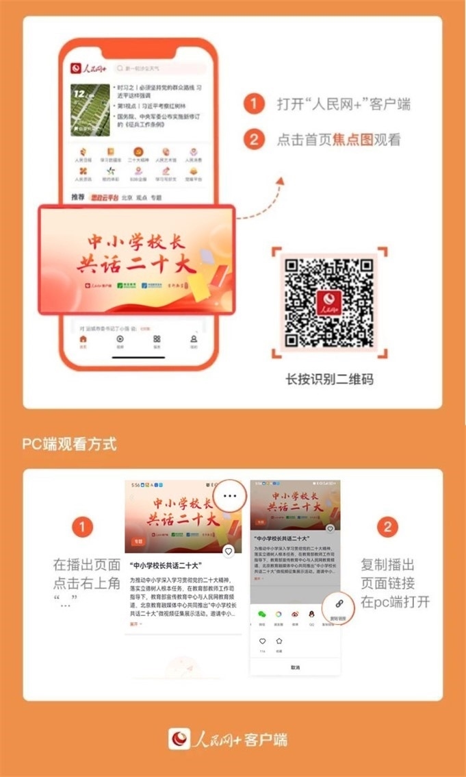 5月12日起,“人民網(wǎng)+”客戶端推出“中小學(xué)校長(zhǎng)共話二十大”專題節(jié)目,每日11:00上新,圍繞黨的領(lǐng)導(dǎo)、鑄魂育人、教育改革、教育公平、強(qiáng)師興校等話題述成績(jī)、言感悟、談現(xiàn)狀、話未來,切實(shí)把黨的二十大精神轉(zhuǎn)化為辦學(xué)治校、教書育人的實(shí)際行動(dòng)。讓我們一起傾聽全國(guó)百位中小學(xué)校長(zhǎng)共話二十大,共同描繪教育事業(yè)發(fā)展的新藍(lán)圖。